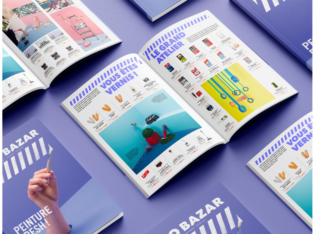 Chargés de l’identité et de la direction artistique, nous avons proposé de mettre en scène des mains qui vaquent à leurs occupations au milieu de décors très graphiques et pop où sont présents les différents produits. Les scènettes animées en boucle furent diffusées sur les réseaux sociaux, les images fixes quant à elles furent publiées dans le magazine BRICO BAZAR.